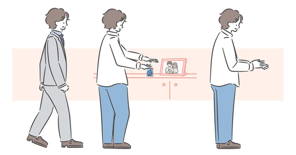 YouTube動画に使用される人物(1人につき4ポーズ程度)や、メインフレーム用の家族写真・小物イラストなどの素材を複数枚制作。これらのイラストを動画内で動かしていただくことで、”大切な人のための消毒”というテーマに寄り添った、温かくほっこりとした世界観を表現していただきました。