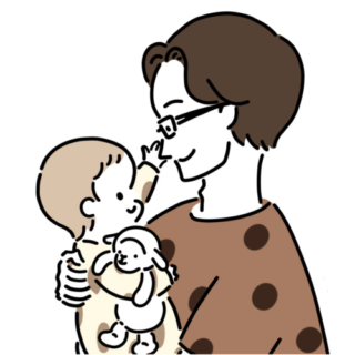 対面で親子の仲睦まじい様子を表しました♪赤ちゃんのお気に入りのぬいぐるみも一緒に描いて、イラストのアクセントにしています(^^)