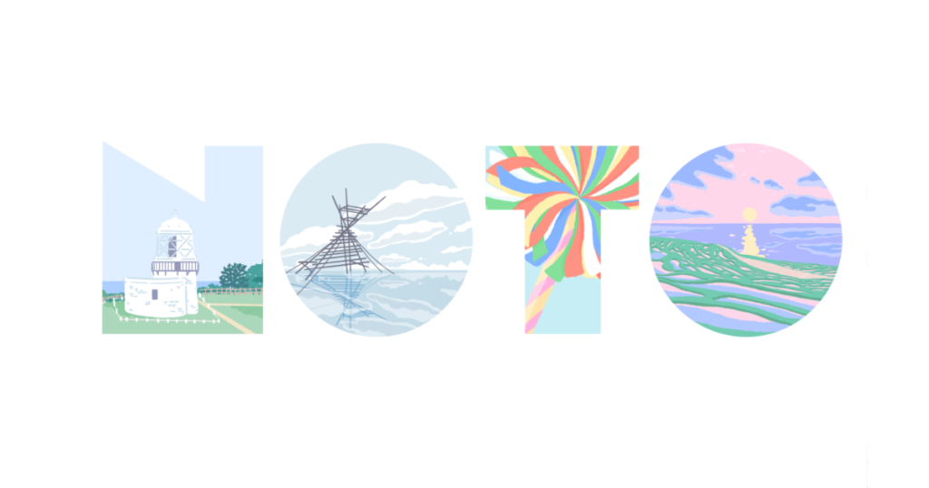 「NOTO」の文字をかたどった窓から、珠洲市の禄剛崎灯台、穴水町のボラ待ちやぐら、七尾市・青柏祭の「ざい」、輪島市の白米千枚田の風景がのぞくデザインです。旅先で車窓やカメラのレンズを通して景色を眺めているような、穏やかで温かいイメージを込めて制作しました。